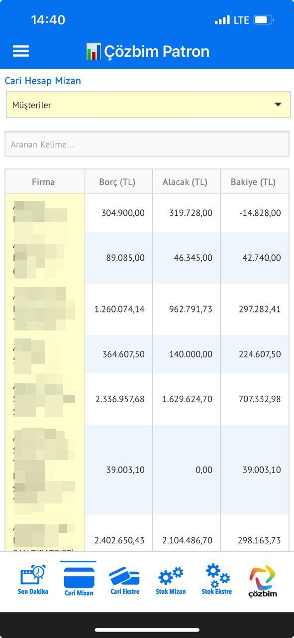 Sistemi kullanma hakkı olan yöneticiler, cari hesap mizanlarını, müşterileri, satıcıları, bankaları, kasa durumlarını, gider hesapların mizanlarını ayrı ayrı görebilirler.