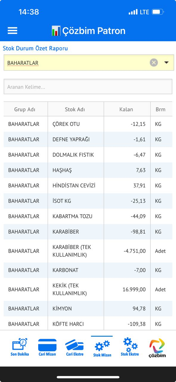 Sistemi kullanma hakkı olan yöneticiler ayrıca, stok gruplarının mizanlarını, ayrı ayrı görebilirler.